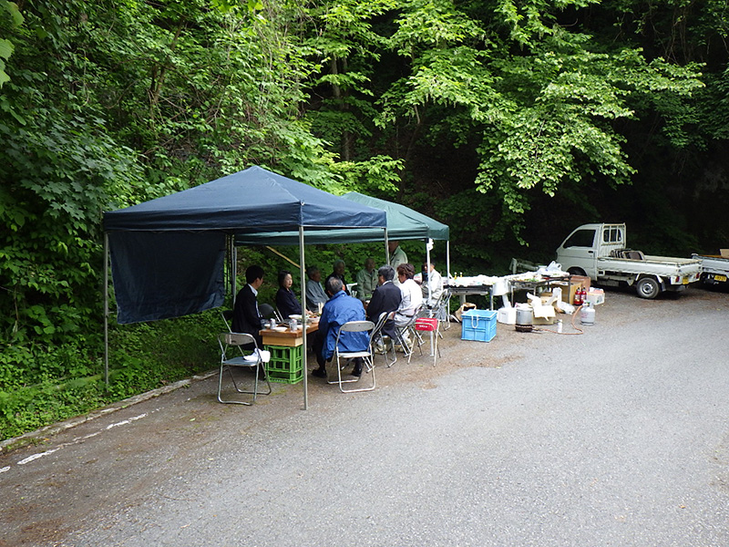 この太田部地域に工事を携わり、40年。数少ない住民と関係者が集まり、昔話に花を添える。